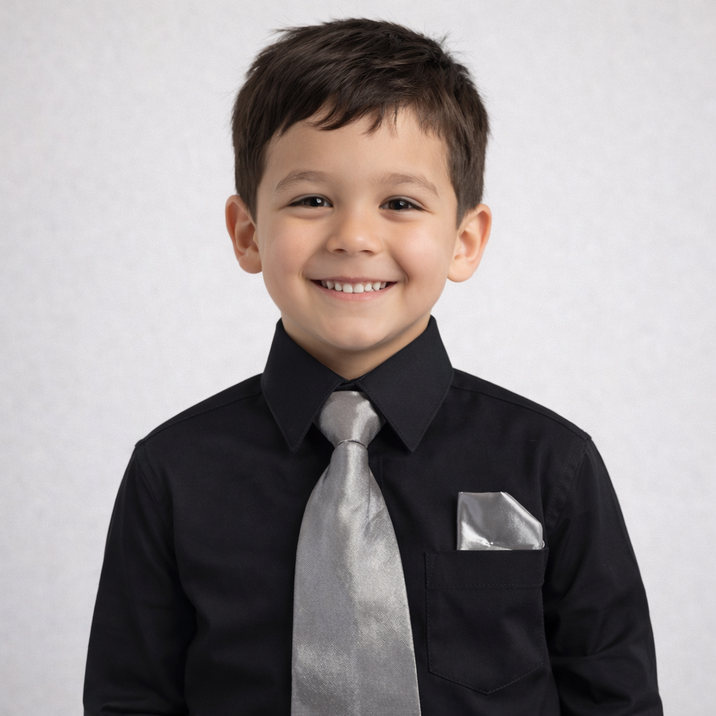 Crafted with a soft and breathable fabric blend, this long-sleeve dress shirt offers a clean, tailored appearance while remaining lightweight and flexible β ideal for active kids during formal events. The set is completed with a matching satin tie and satin handkerchief, adding a classic and elegant finishing touch. β¨π