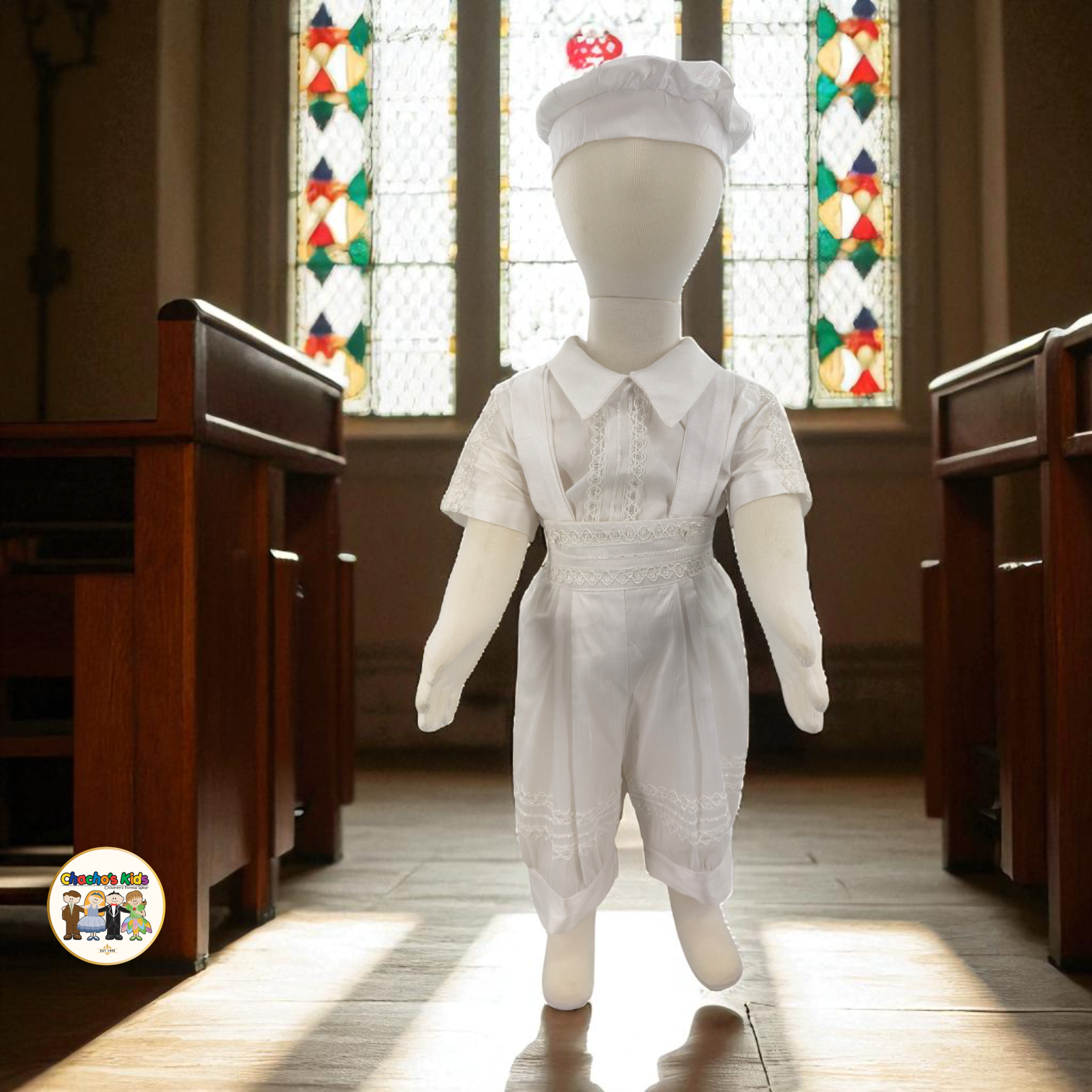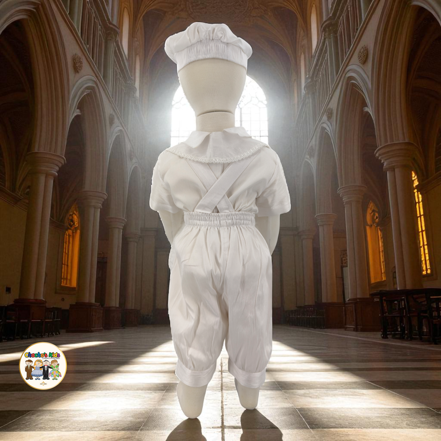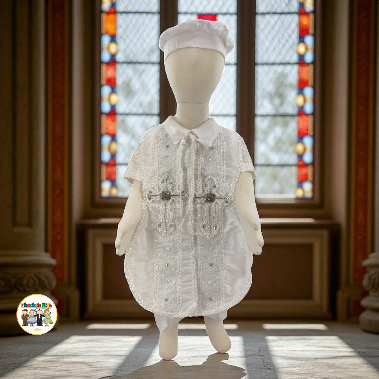 -Includes a shirt, romper-style pants, embroider stole , bow tie, and matching hat