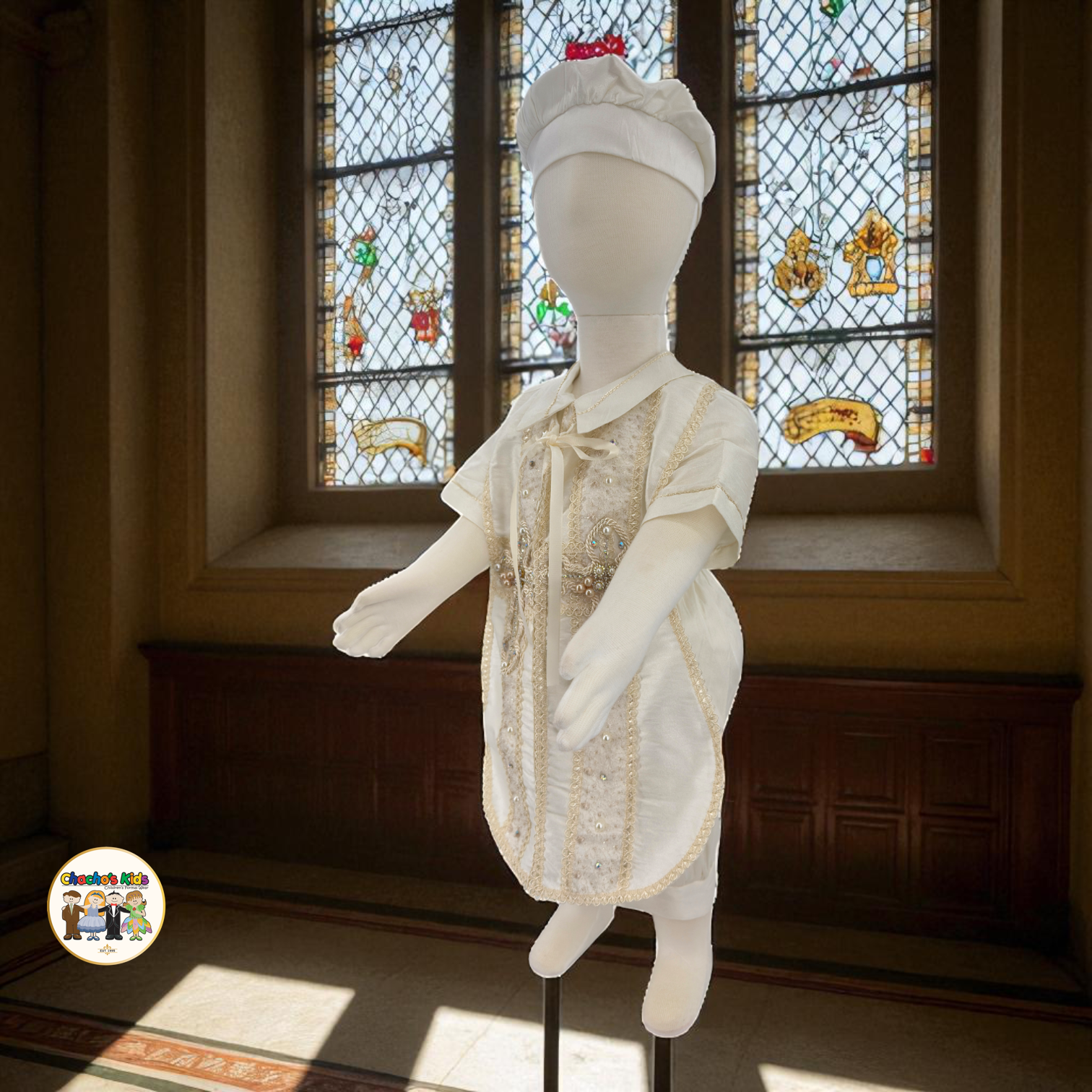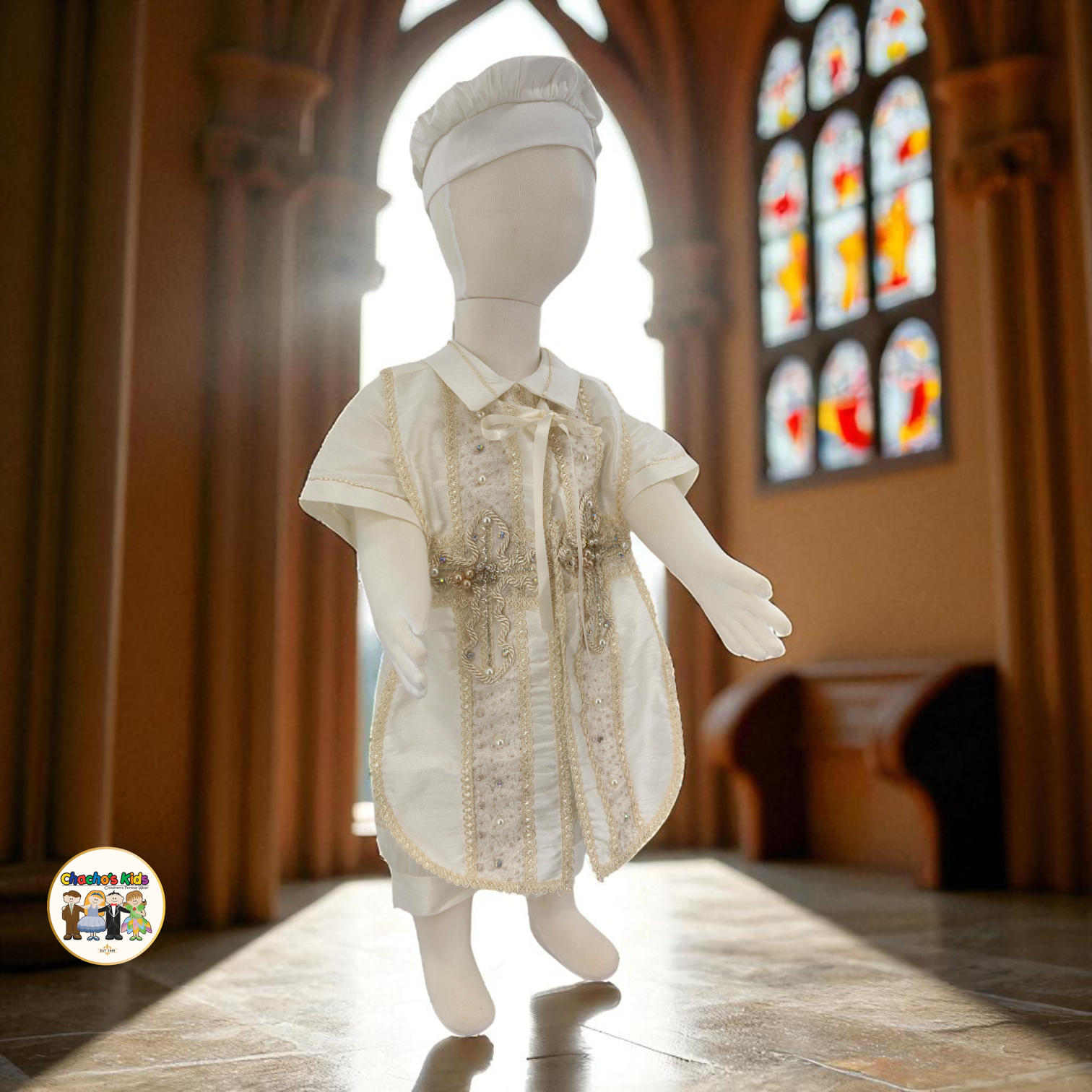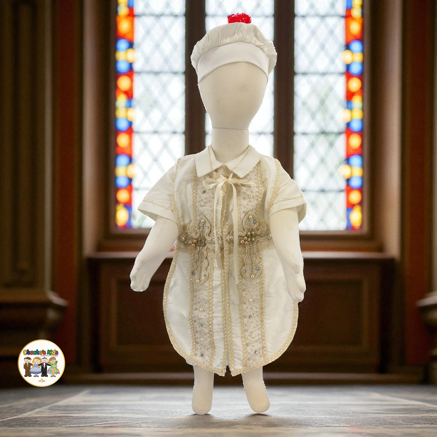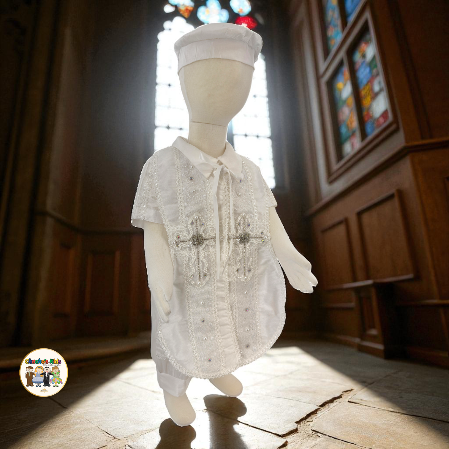 -Includes a shirt, romper-style pants, embroider stole , bow tie, and matching hat