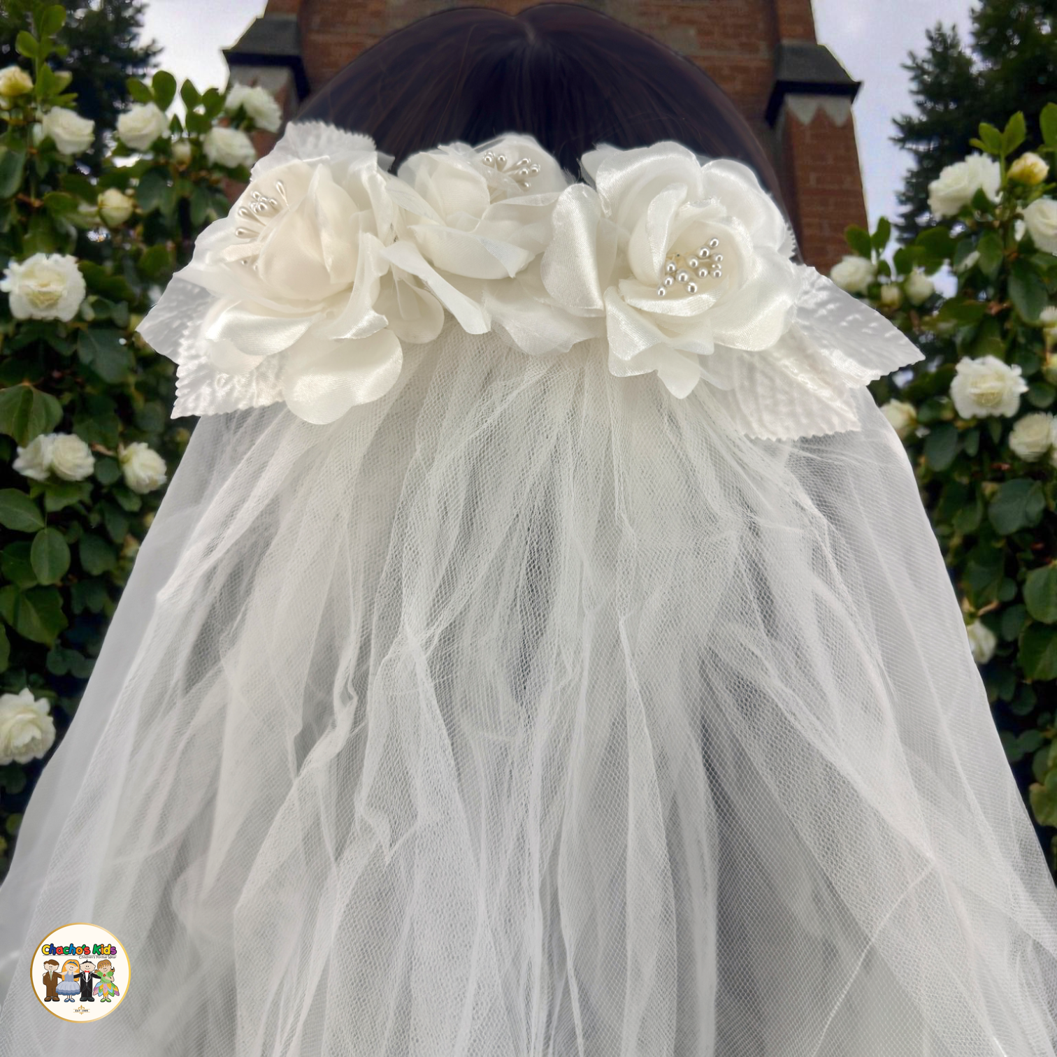 This elegant ivory First Communion veil is a beautiful symbol of purity and grace, designed to softly frame your child’s special day. The delicate floral crown features layered fabric flowers with embroidered leaves and subtle pearl bead accents at the center of each bloom, creating a timeless and refined look. 🌸🤍