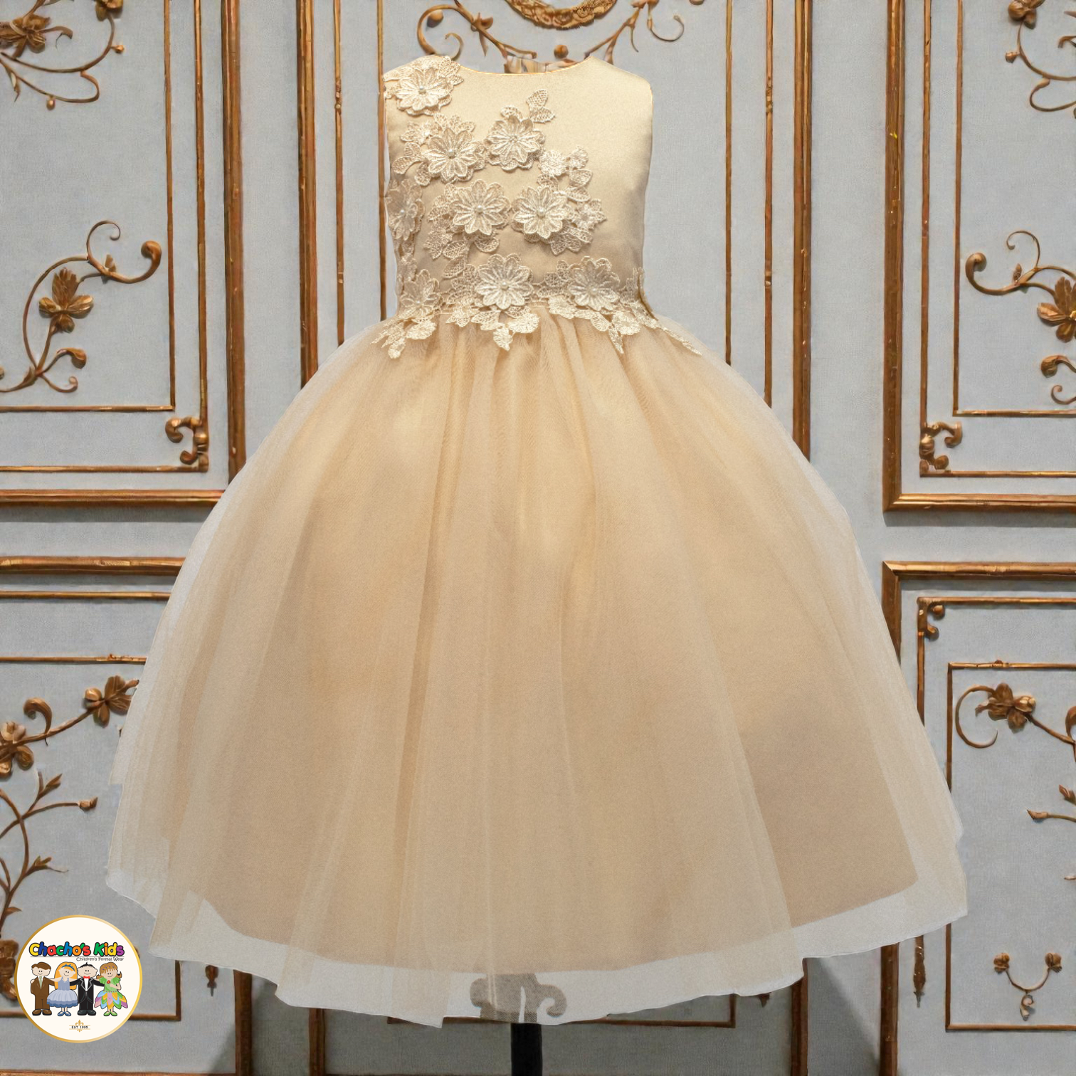 This enchanting champagne-colored dress is designed to make your little girl look and feel like a true princess. The bodice features stunning 3D floral appliqués arranged gracefully across the front, adding texture, elegance, and a soft romantic charm. 🌼✨