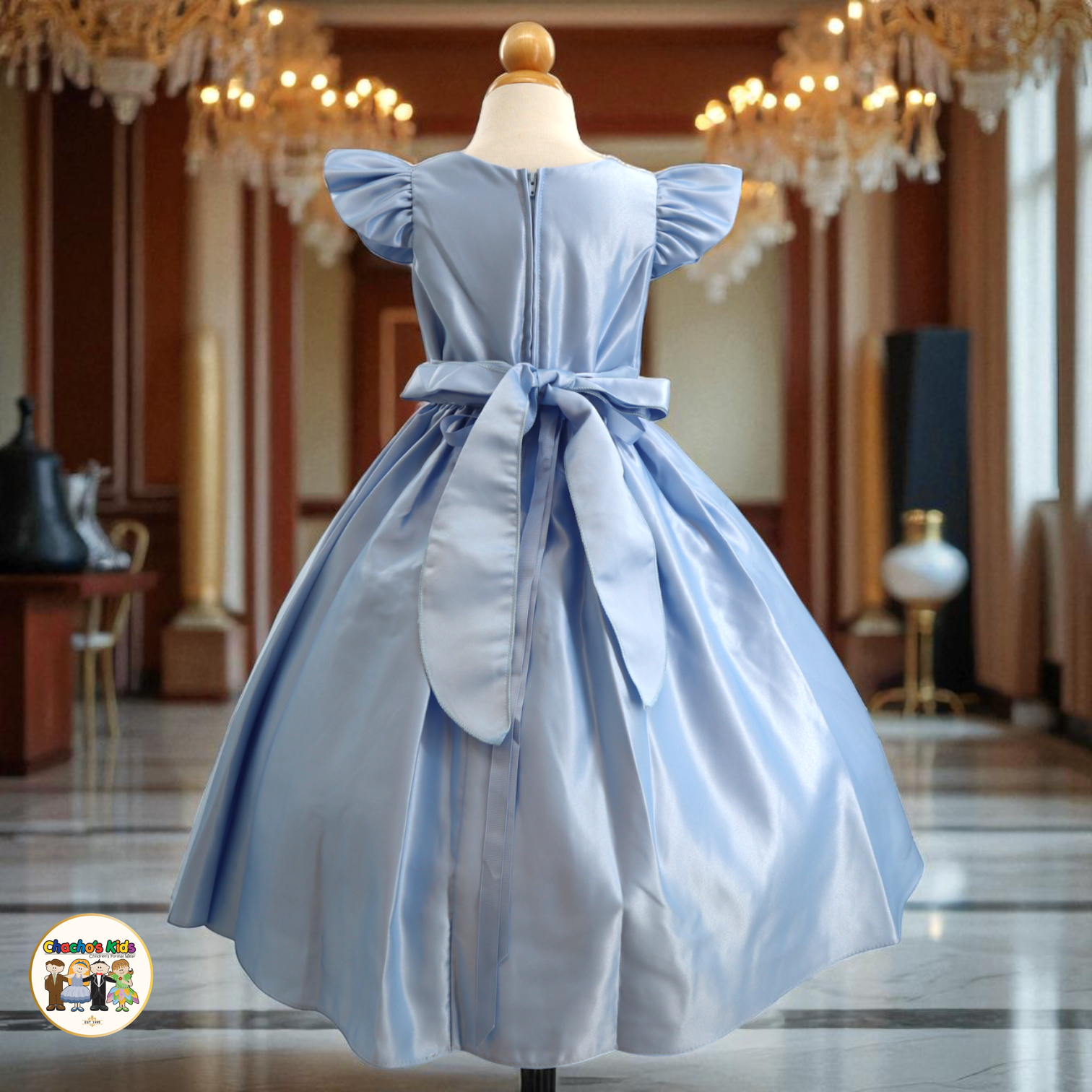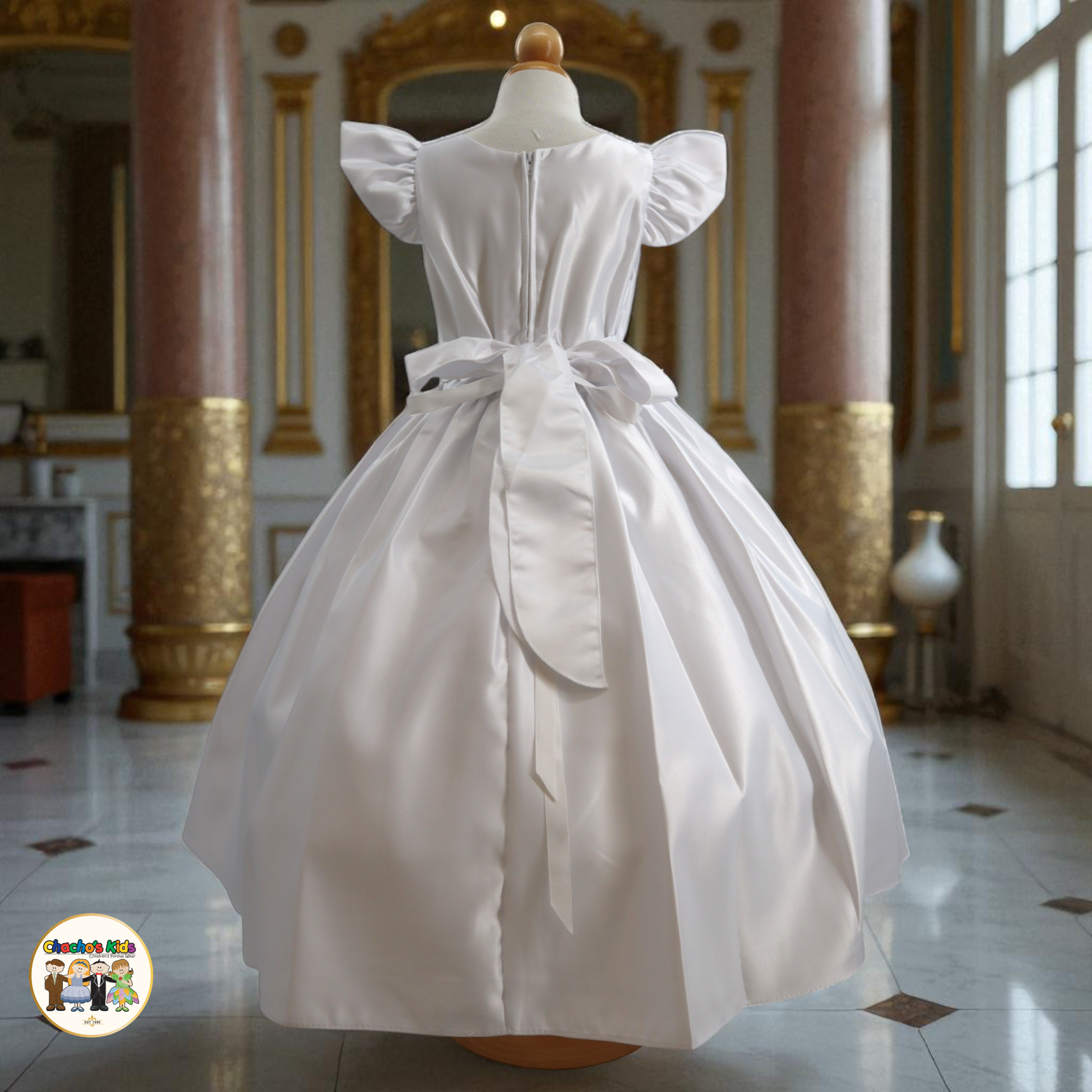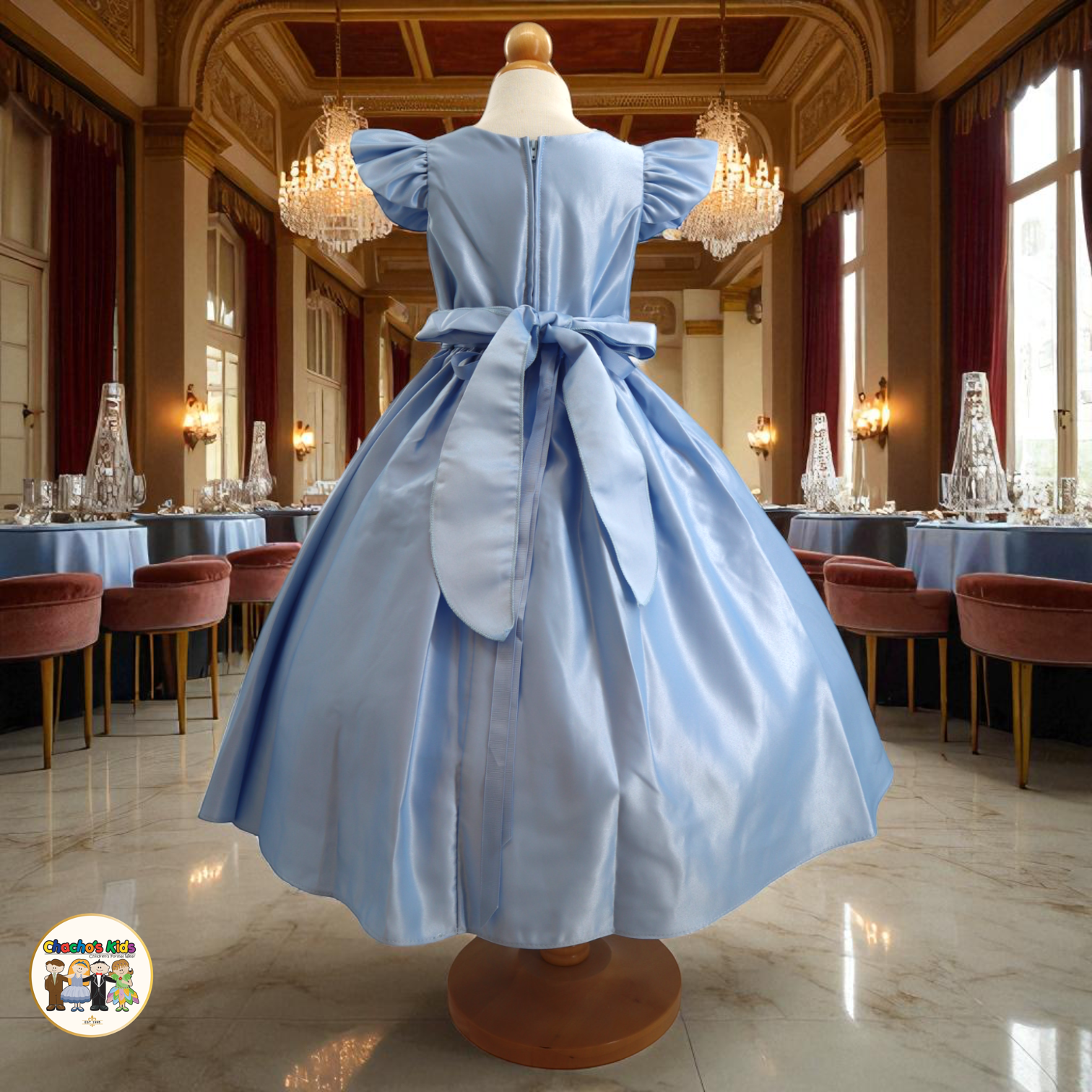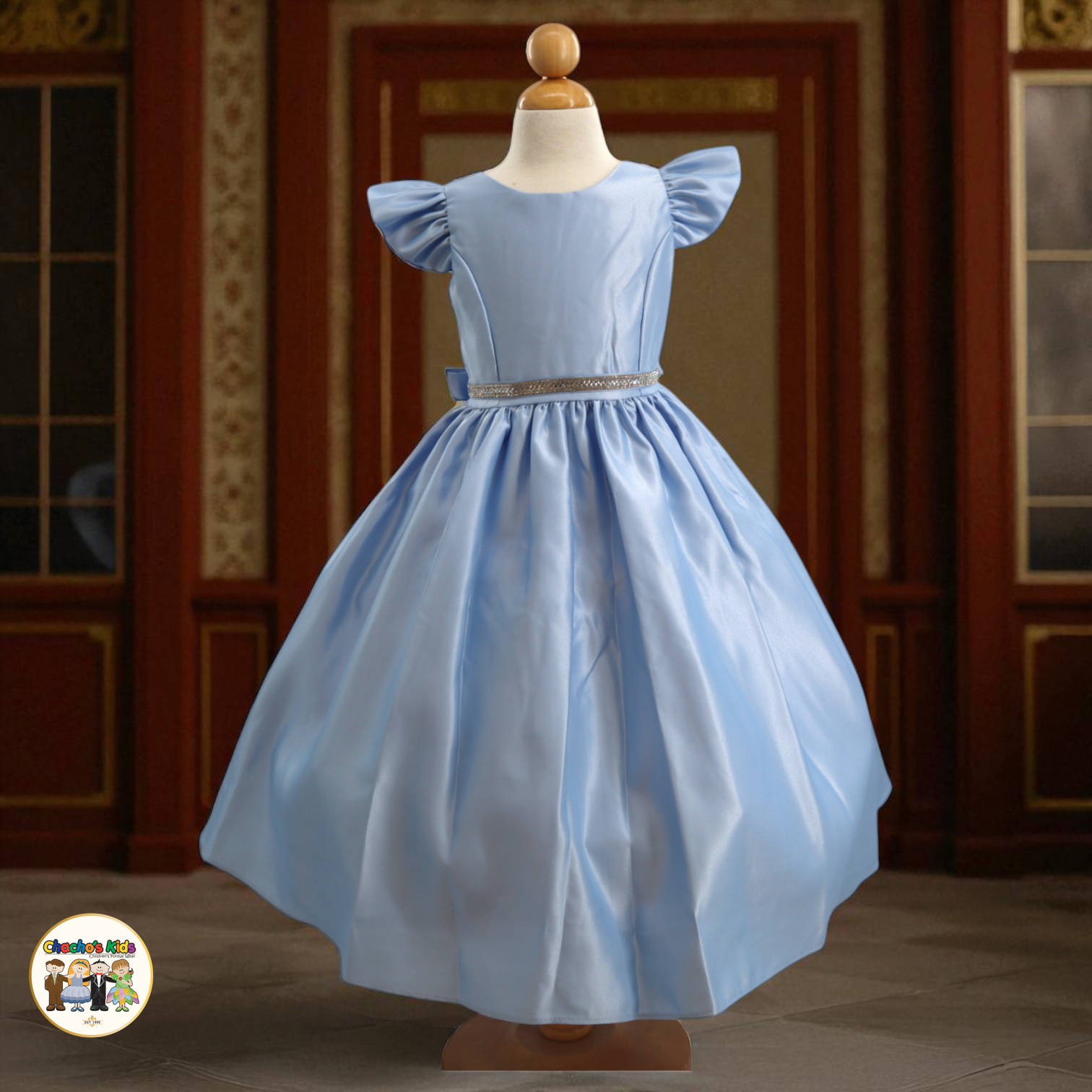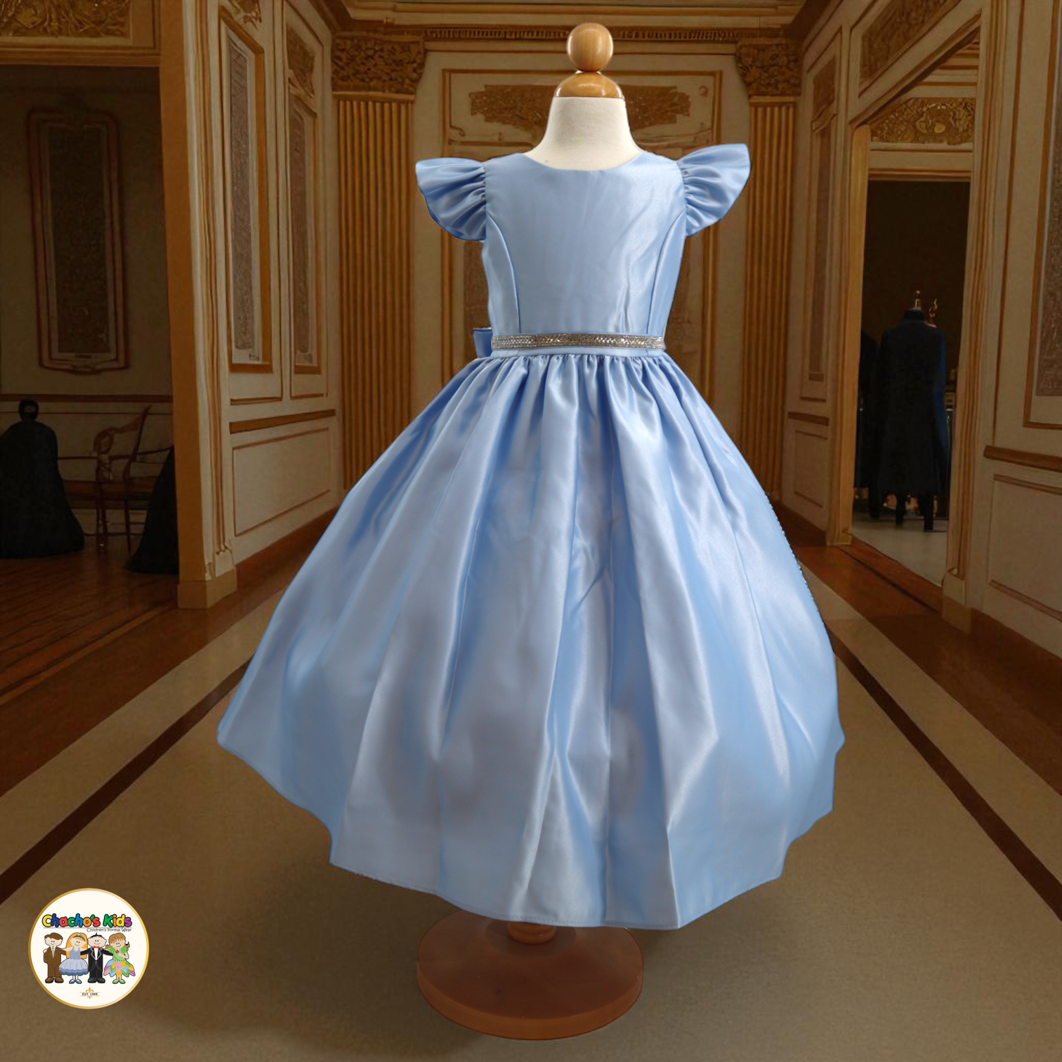 🌸 The dress features graceful flutter sleeves and a full-length skirt with a voluminous princess silhouette. Around the waist, it comes with a removable sparkling tiara belt 👑 that adds the perfect touch of glamour. The back ties with two satin straps, forming a beautiful bow 🎀 for a classic princess finish.