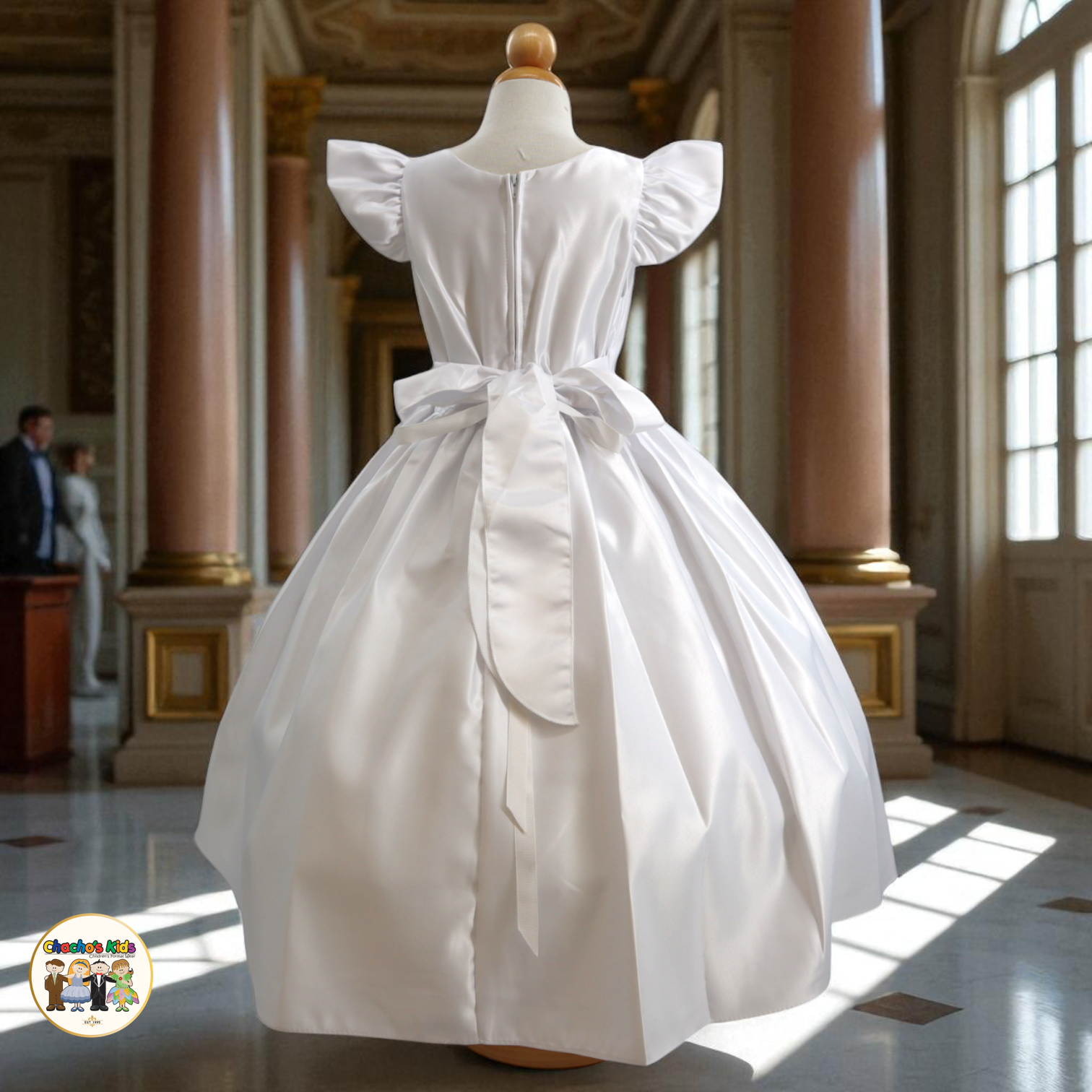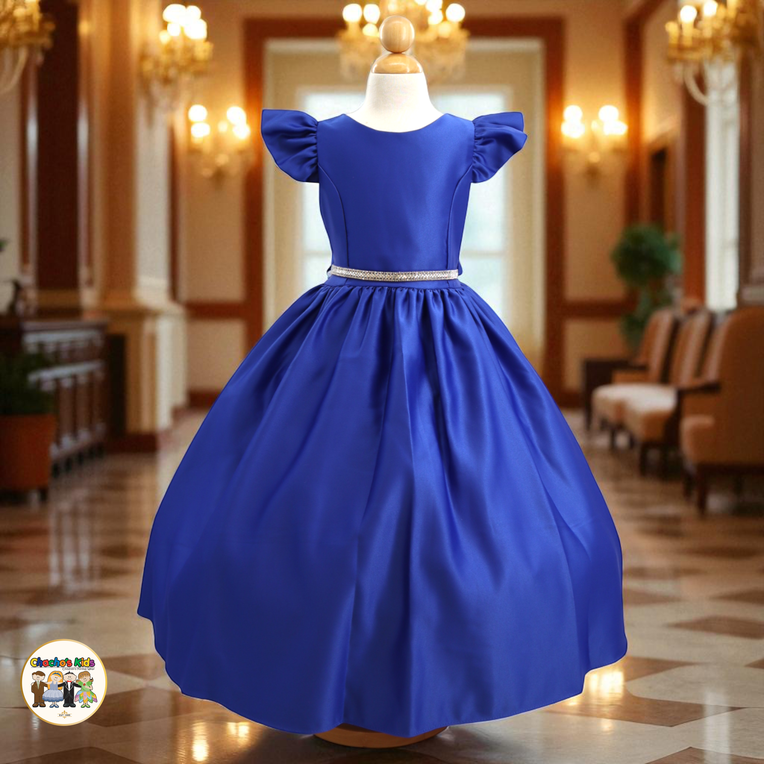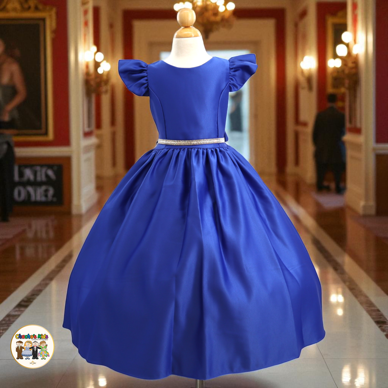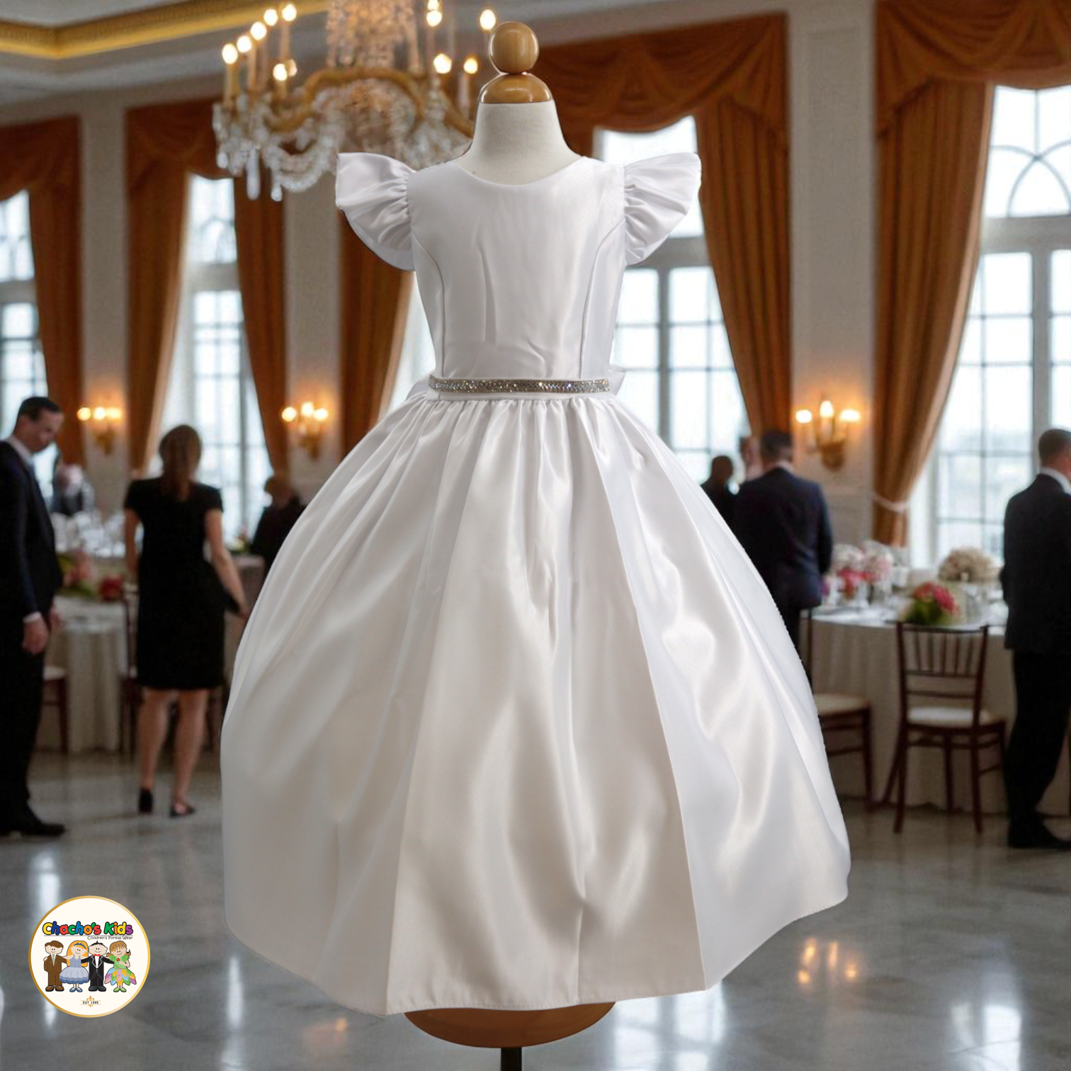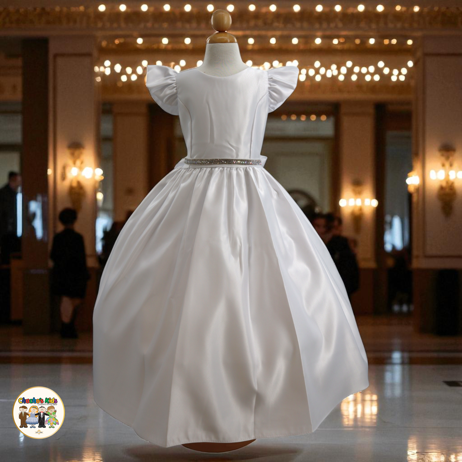 🌸 The dress features graceful flutter sleeves and a full-length skirt with a voluminous princess silhouette. Around the waist, it comes with a removable sparkling tiara belt 👑 that adds the perfect touch of glamour. The back ties with two satin straps, forming a beautiful bow 🎀 for a classic princess finish.
