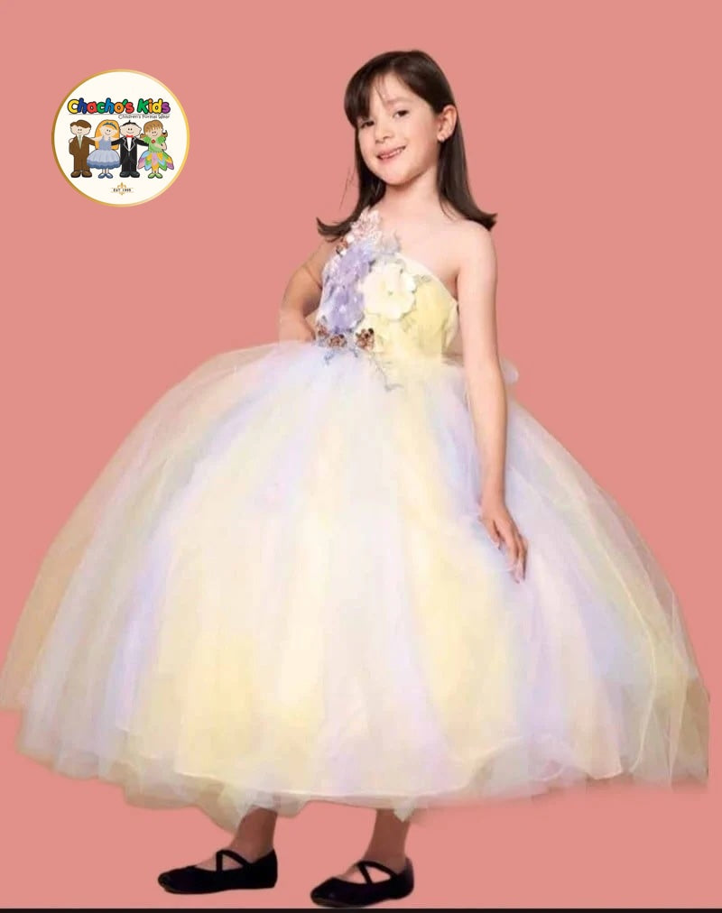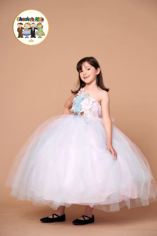 This stunning party dress is designed to make your little girl shine like a true princess at any special occasion. The strapless bodice features beautiful floral appliqués with soft pastel accents, delicately arranged to create a charming and elegant focal point. 🌼✨ The floral details are complemented by subtle sparkle accents that add just the right touch of magic.