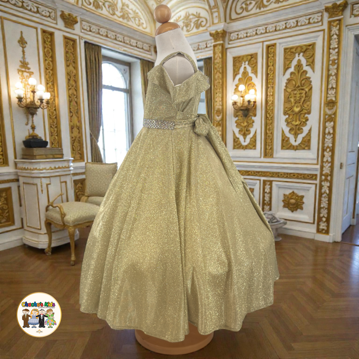Crafted with a beautiful shimmer fabric, this dress sparkles subtly with every movement, creating a magical effect under lights and in photos. The fitted waist is accented with a dazzling rhinestone belt, perfectly highlighting the silhouette before flowing into a full, structured skirt thatβs ideal for twirling and grand entrances. β¨π